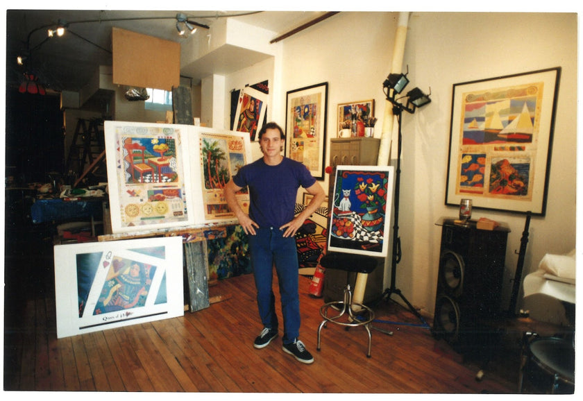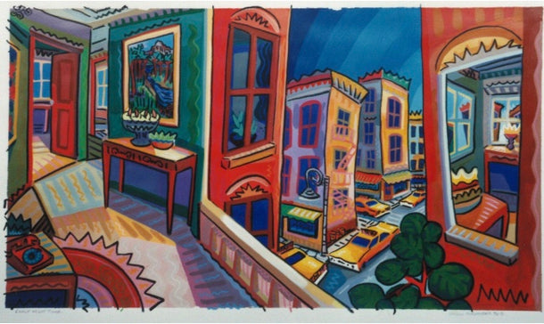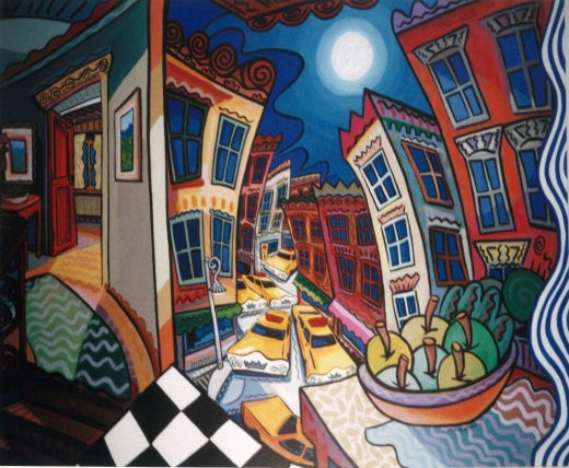 In his first studio, Jason began his iconic "Room With A View" series—bold urban dreamscapes with cube-like geometry, taxi cabs, and angled buildings. Over a decade, more than a thousand works and prints from the series were sold across North America and Europe.